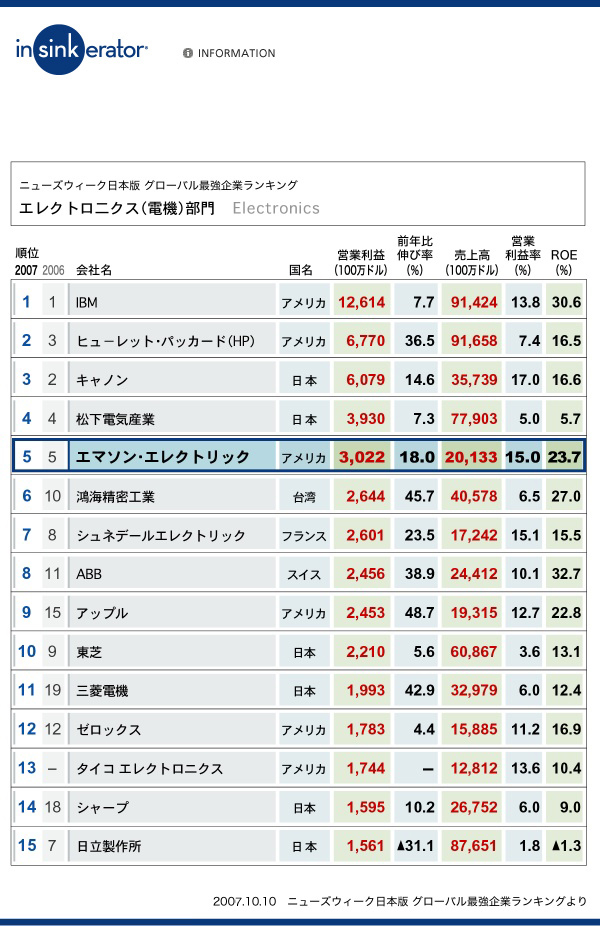 Newsweek 日本語版(10月10日号)の特集記事グローバル最強企業ランキング2007で今年も電機部門で並み居る競合を抑えて5位をキープしました。