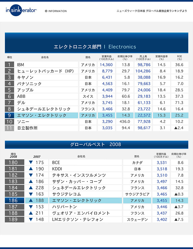 グローバル最強企業ランキング2008電機部門で並み居る競合を抑えてトップ10内を堅持、9位にランキングされました。